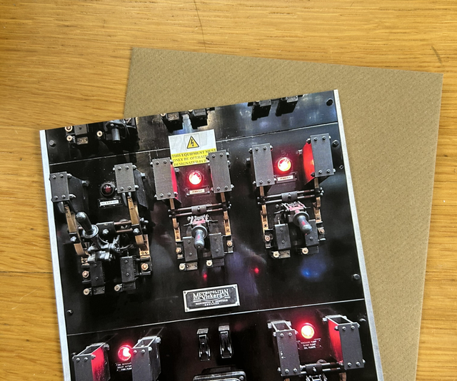 Quirky greetings card. Moody vintage control panel in dark grey with warm red lights.